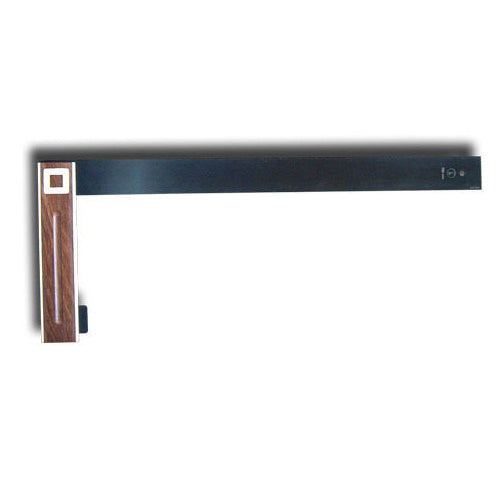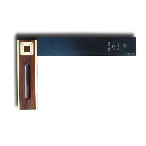 Kopfstück (Schenkel) aus hochwertigem Palisanderholz mit Griffhohlkehlen und beidseitig eingelassenen Messingprofilschienen. Stahlschienen gehärtet und gebläut, Verbindung von Kopfstück und Stahlschienen durch beidseitig eingelassene Messingrahmen mit 4-fach- Vernietung. Diese Verbindung garantiert die hohe und dauerhafte Messgenauigkeit von ± 0,02 mm bei Winkeln 150, 250 und 350 mm, ± 0,04 mm bei Winkel 600 mm.