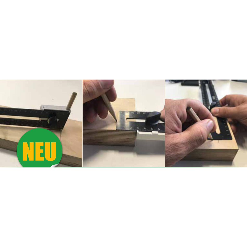 Dieses neuartige Werkzeug vereint 3 Funktionen in einem: Streichmaß, Zirkel und 45° Anschlag.