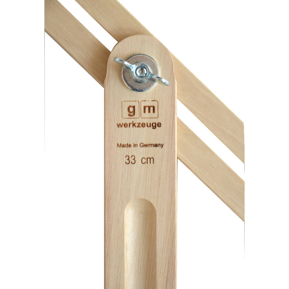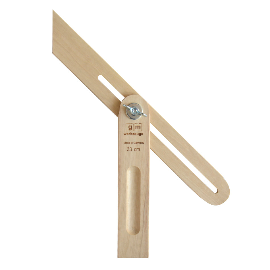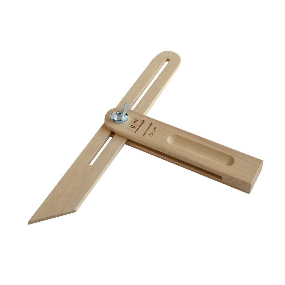 zum Abnehmen, Übertragen und Anreißen beliebig großer Winkel. Kopfstück (Schenkel) aus hochwertigem Weißbuchenholz, beidseitig mit eingefräster Griffhohlkehle. Bewegliche Schiene (Zunge) ebenfalls aus Weißbuchenholz, Arretierung der beliebigen Winkellagen durch Flügelmutter und Spezial- Unterlagscheibe. Durch bis zum Ende reichenden Schlitz für Innenmessungen geeignet.