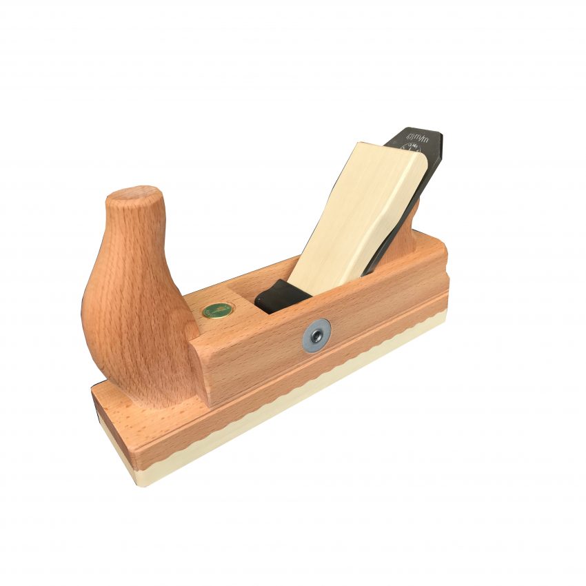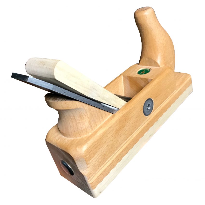 Hobelkörper aus gedämpftem Rotbuchenholz mit starker, tiefer und spitzer Schrägverzahnung und aufgeleimter Weißbuchensohle. Hobelnase und Handschoner ebenfalls aus gedämpftem Rotbuchenholz nach ergonomischen Erkenntnissen griffgerecht geformt. Für Rechts- und Linkshänder geeignet. Hobeleisen aus hochwertigem Werkzeugstahl.