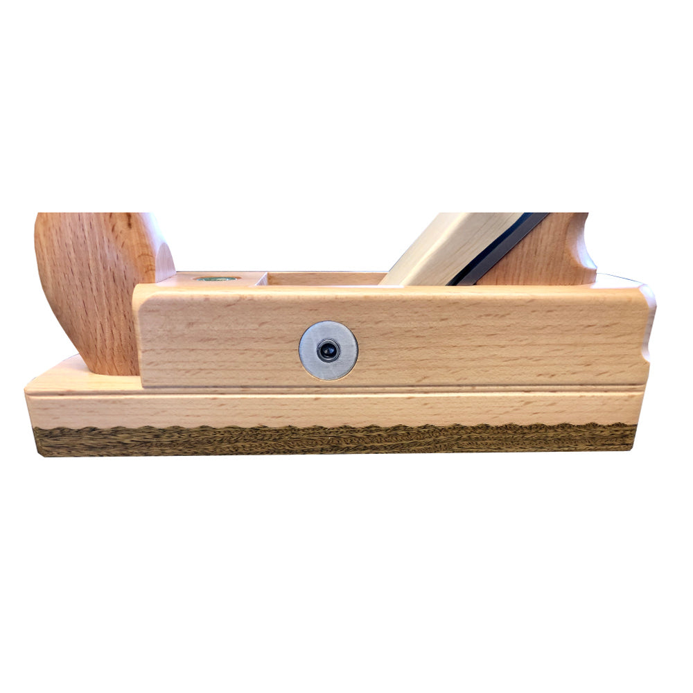 Hobelkörper aus gedämpftem Rotbuchenholz mit starker, tiefer und spitzer Schrägverzahnung und aufgeleimter Pockholzsohle. Hobelnase und Handschoner ebenfalls aus gedämpftem Rotbuchenholz nach ergonomischen Erkenntnissen griffgerecht geformt. Für Rechts- und Linkshänder geeignet. Hobeleisen aus hochwertigem Werkzeugstahl.