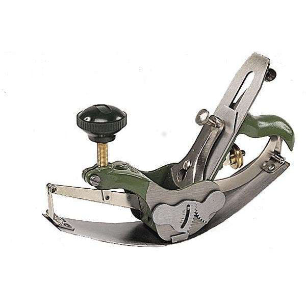 Hobelkörper und Bedienelemente aus Metall, mit Doppeleisen, Eisenbreite 44mm. Eisensohle konvex und konkav verstellbar, dadurch Anpassung an jeden Radius der zu bearbeitenden Rundung möglich. Verstellung der Eisensohle durch Stellschraube.