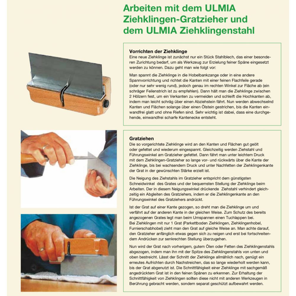Ulmia Ziehklingengratzieher eignen sich hervorragend, um rechteckige Ziehklingen aufzubearbeiten. Da das Anziehen eines gleichmaßig geneigten Schneidgrates mit dem Ziehklingenstahl sehr viel Übung erfordert, kann mit dem Ziehklingengratzieher an jede rechteckige Ziehklinge mühelos in wenigen Minuten ein starker, einwandfrei gleichmäßiger Grat angebracht werden.